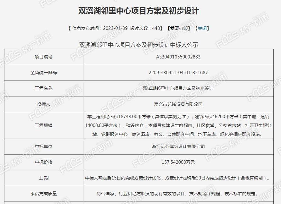 双溪湖邻里中心项目方案及初步设计中标公示