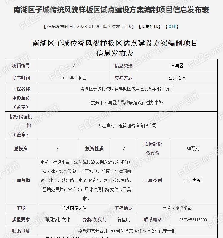1月6日,官网发布南湖区子城传统风貌样板区试点建设方案编制项目的招标公告。