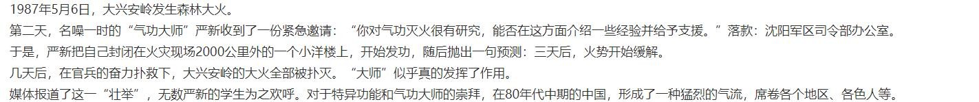 而关于大兴安岭救火这件事,中国科学院院士何祚庥还曾发表文章批判,认为“严新是救火功臣”这件事是不可理喻:“严大师早不灭火晚不灭火,偏等大火快要将森林烧光了,他才发功灭火!”
