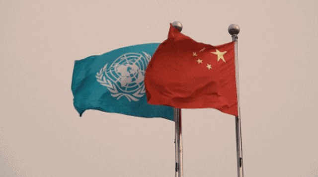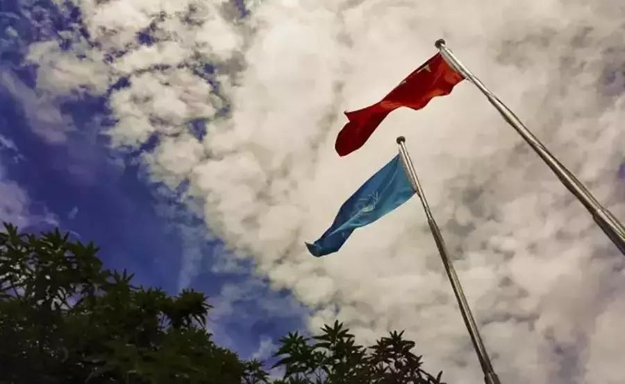 在五星红旗和联合国的旗帜下,