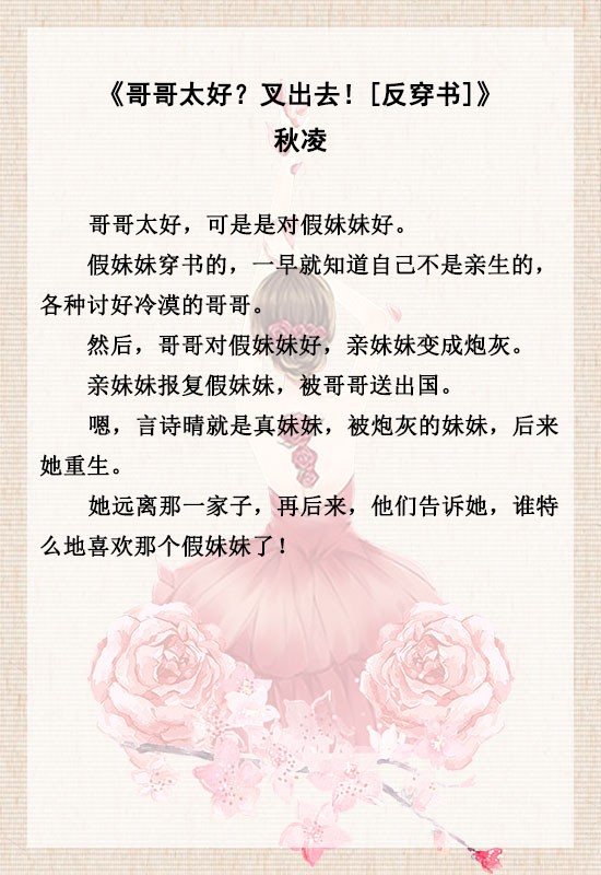 【短评】穿书女穿成假千金后,为了不炮灰抱女主哥哥大腿,还借机打压女主,害得女主被赶出国,重生后女主果断远离他们。