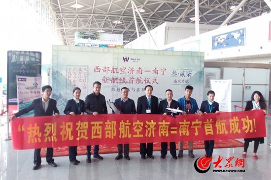 大众网济南3月27日讯(记者 王宗阳 通讯员 杨怡)今天晚上,从济南机场起飞的西部航空PN6367次航班,平稳降落在南宁吴圩国际机场,济南-南宁新航线首航圆满成功。