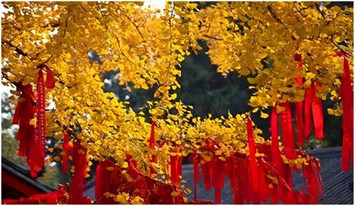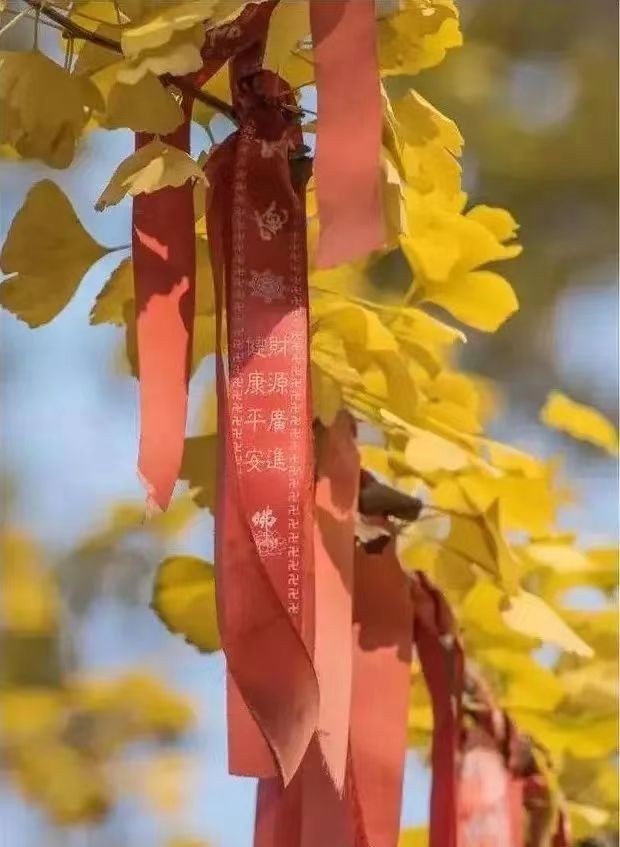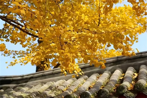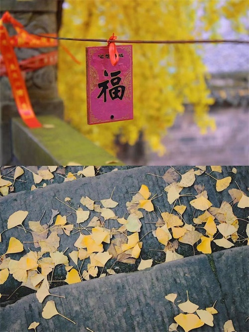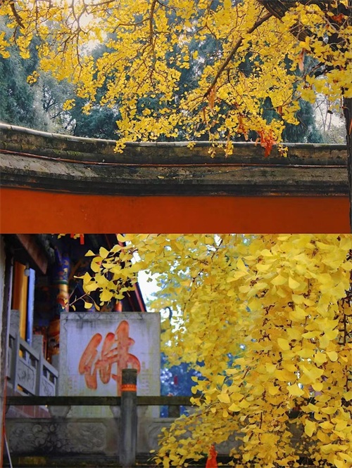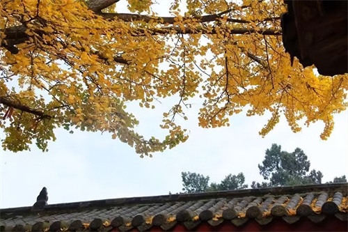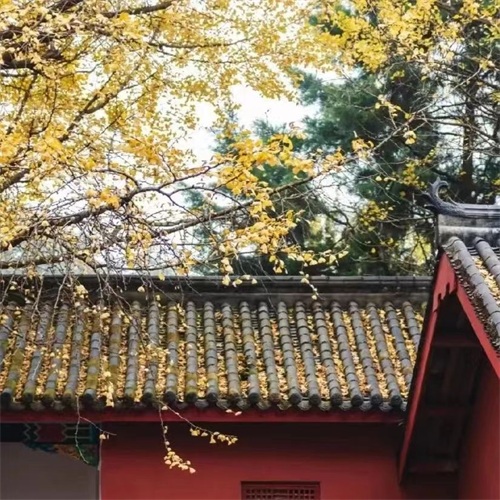 叶黄如金,与寺相伴,禅意弥漫。古色古香的寺庙与枝繁叶茂的银杏相互交织,简直让人挪不开眼。不仅银杏迷人,在慈云寺你还能看到红枫银杏交相辉映,小小一隅古寺,却浓缩了整个秋天的颜色。