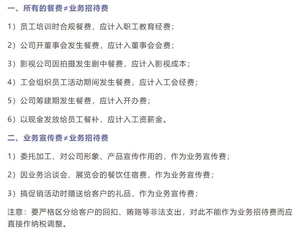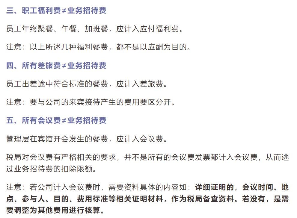 1.所有的餐费、业务宣传费、差旅费、会议费及职工福利费,不都是业务招待费;