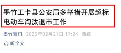 近期,西藏墨竹工卡县正在开展超标电动车淘汰退市工作,公安交警采用流动执法和定点检查等方式,集中整治无牌无照超标电动车,同时还加强乱闯红灯、逆向行驶、不戴头盔等违法上路行为的治理。治理期间,无牌无照超标电动车违规上路,交警部门将进行暂扣或者报废处理。