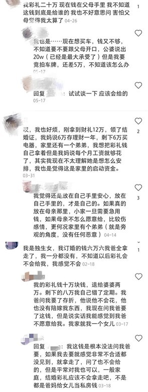 当然,比较传统的父母则会将所有彩礼钱留下,比如给儿子以后娶媳妇用,或者为自己以后养老准备,因为在她们的观念中认为,辛辛苦苦养大的女儿留下彩礼钱也是应该的。