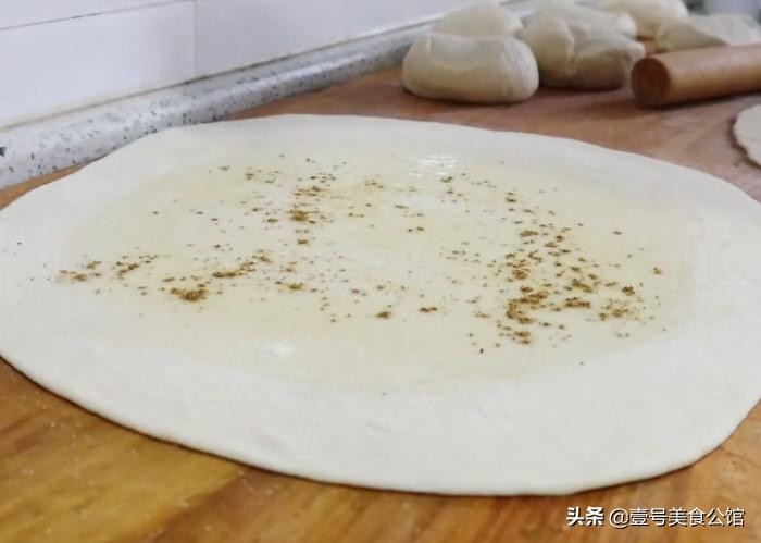 第五步:在薄饼的中央刷上一层食用油,而后撒一些胡椒粉,椒盐或者辣椒面,喜欢吃葱花的话也可以撒些葱花。