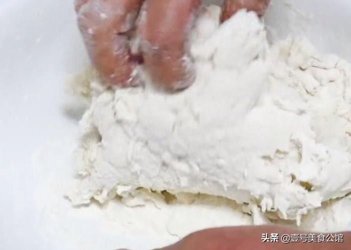 第一步:而后我们往往碗中分次加入35度左右的温水,用筷子不停搅拌至絮状后,停止加水,开始揉面团。