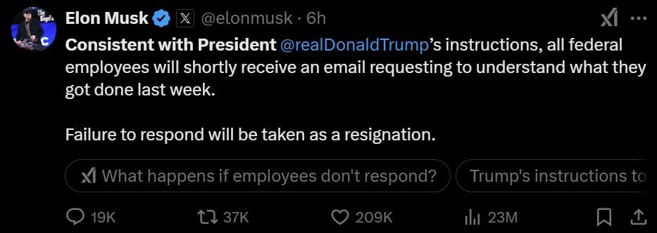 马斯克给美国公务员群发邮件:发工作周报,否则将被裁员