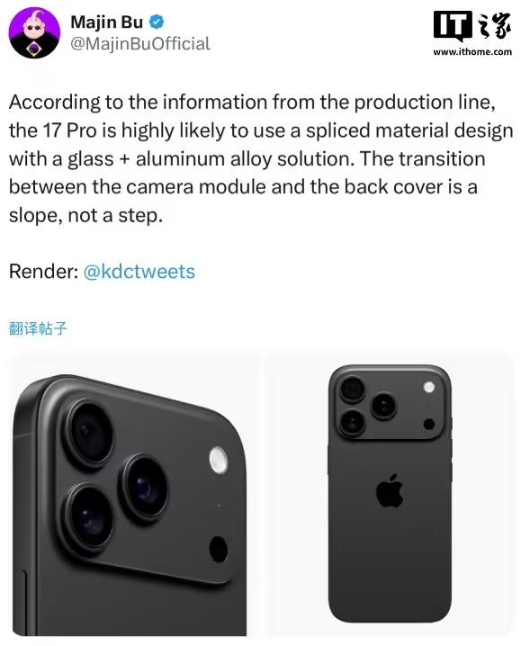 2 月 23 日消息,海外博主 Majin Bu 分享一则生产线消息,据称苹果 iPhone 17 Pro 可能采用铝合金和玻璃拼接设计,相机模块与后盖之间的过渡是斜面,而非阶梯状。