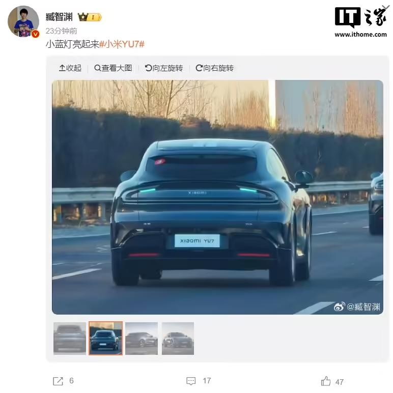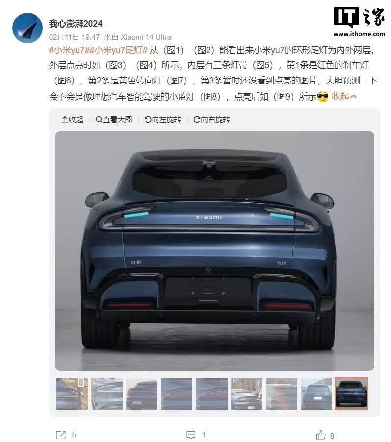 2 月 22 日消息,今日下午网上流传出了一张小米 YU7 汽车上路的图片,可以看到尾灯部分有两个小小的蓝色灯光,预计是开启智驾后的提示灯。