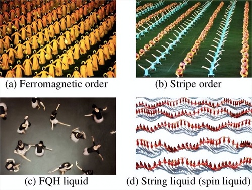 朗道对称破缺态的内部结构,可以形象地用不动的图案来表示:(a)铁磁态,(b)条状反铁磁态。拓扑序的内部结构,可以形象地用不同的舞蹈方式来表示:(c)量子霍尔态中的电子像在跳旋转的芭蕾舞,(d)自旋液体中的自旋,手拉手,像在跳长龙舞。