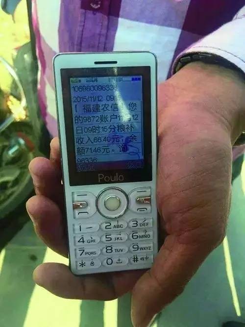 福建省漳州市长泰县陈巷镇西湖村村民刘美山刚收到了种粮补贴,他正在向记者展示农信社发给他的短信提示