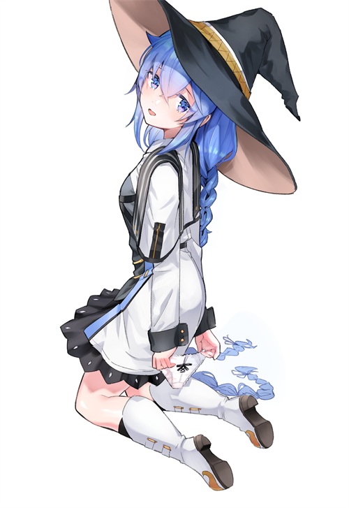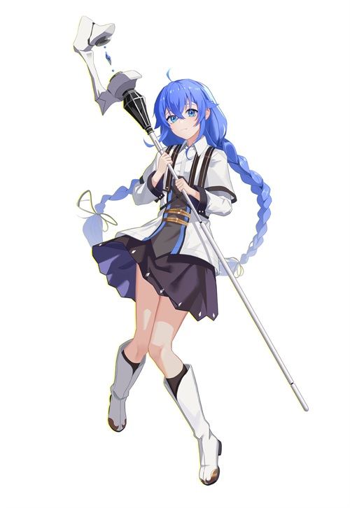 留着蓝色长发,绑着麻花辫。带着黑色的法师帽,穿着白色的法师长袍,腿上穿着中筒的黑色长袜以及白色的长筒靴。
