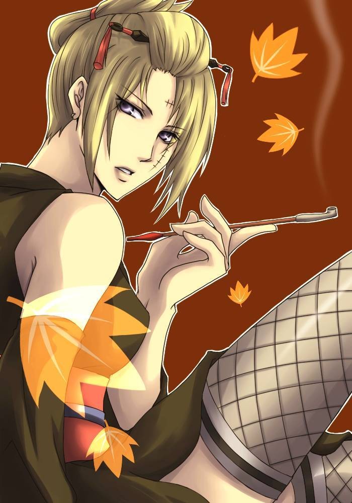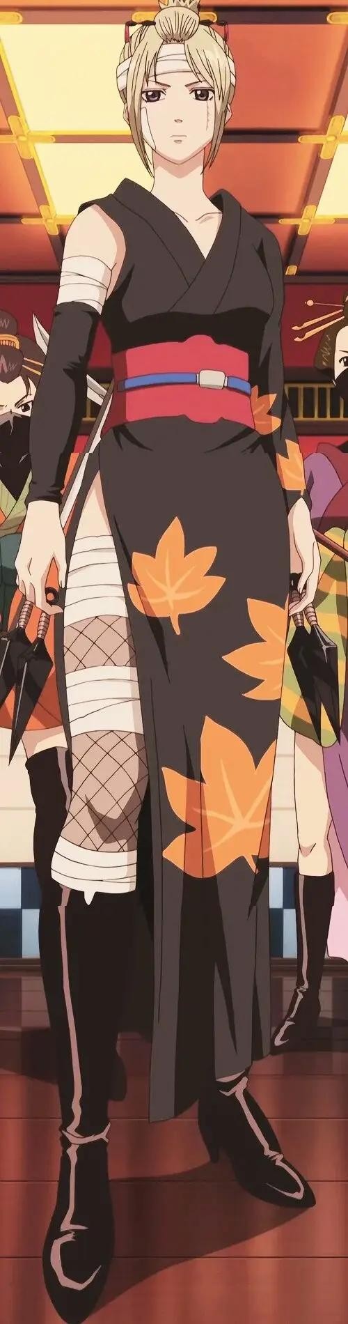 棕黄色绾起的中长发,紫瞳,额前的头发上插有苦无状的饰物。平时穿只有左侧袖子与下摆的带枫叶图案的黑色浴衣,鞋袜为黑色渔网丝袜和高跟尖头靴子。 拥有前凸后翘的完美身材。