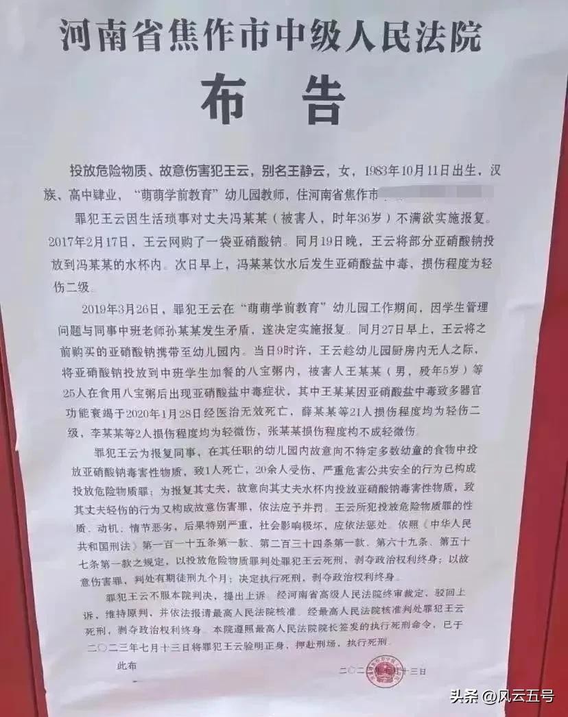 昨日,河南省焦作市中级人民法院公告,致25名幼儿中毒、投放危险物质、故意伤害犯王云,7月13日被押赴刑场,执行死刑。