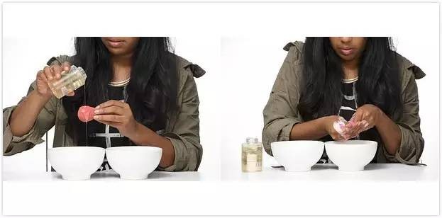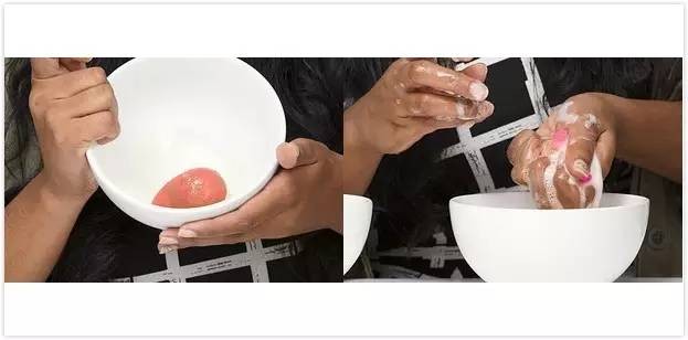 如何清理:首先将1:1的两种液体混合,将浸湿的美妆蛋混入其中,用手搓揉出残余的化妆品,最后用热水冲洗干净,全程大约需两到三分钟。