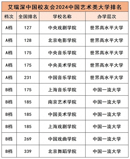 2024年国内哪些艺术类大学实力最强?根据全国第三方大学评价机构艾瑞深校友会网(Cuaa.net)对中国艺术类大学实施的分档评价,中央戏剧学院、北京电影学院、中央音乐学院、中央美术学院、中国音乐学院入选世界高水平大学、中国顶尖大学行列,获评校友会2024中国艺术类大学分档排名最高档(A档)。国内大学的二级学院(如清华美院)不参与此次榜单排名。