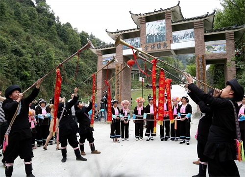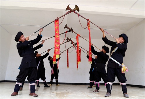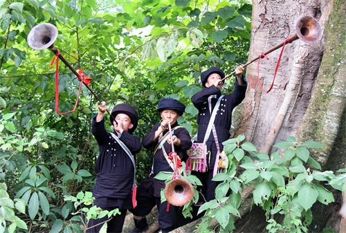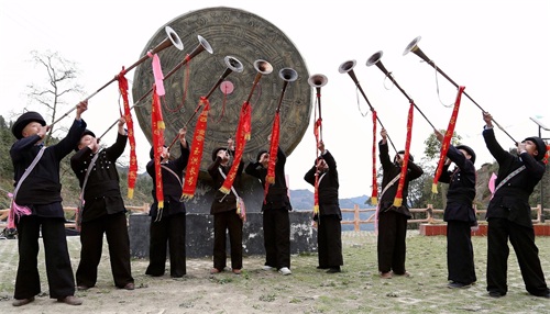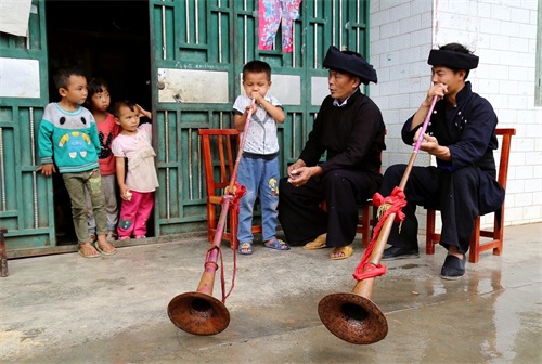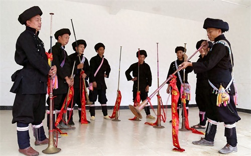 广西壮族自治区百色市凌云县瑶族长号艺术于2012年6月入选第四批自治区级非物质文化遗产代表性项目名录。图为自治区级代表性传承人蒋光明开展传习活动。卢芸 摄