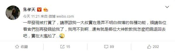 朱孝天微博被打赏 大呼尴尬求网友支招想退钱