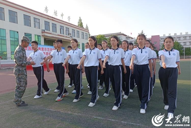 曲阜市国防教育宣讲团成员对杏坛中学学生进行队列训练