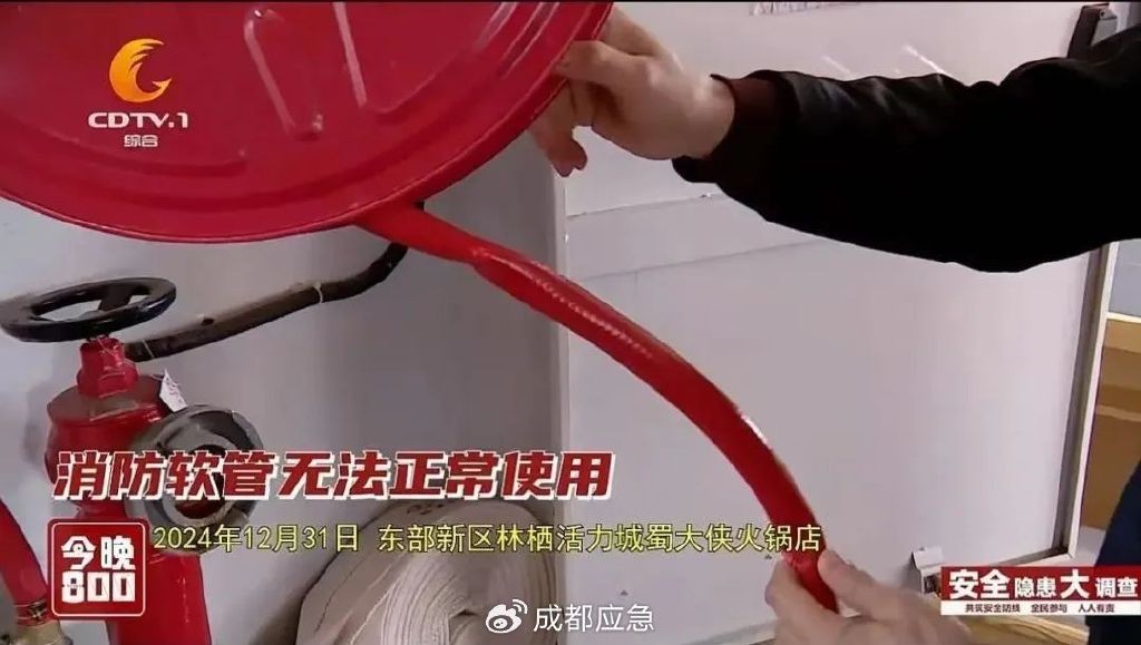 2024年12月31日,消防安全隐患检查组来到东部新区林栖活力城,这里是东部新区大型的商业综合体之一,各类餐饮店铺汇聚,人流量众多。检查组在蜀大侠火锅店进行检查时,发现其配备的消火栓,存在消防软管无法正常使用的问题。消防软管卷盘,由阀门、轮辐、软管和喷枪组成。它可以用来喷洒水,是快速提供灭火用水的关键设备,通常安装在易燃区域或紧急出口处,消防人员可以立即使用软管进行初期灭火,有效控制火灾蔓延,并给其他灭火措施争取时