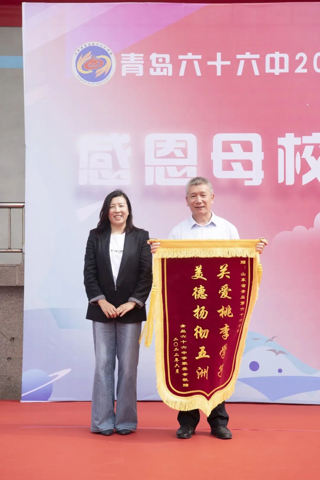 学校家委会代表徐磊女士代表全体高三家长上台送上锦旗,感谢学校对孩子们三年来无微不至的教育与培养,祝福学校越来越好。
