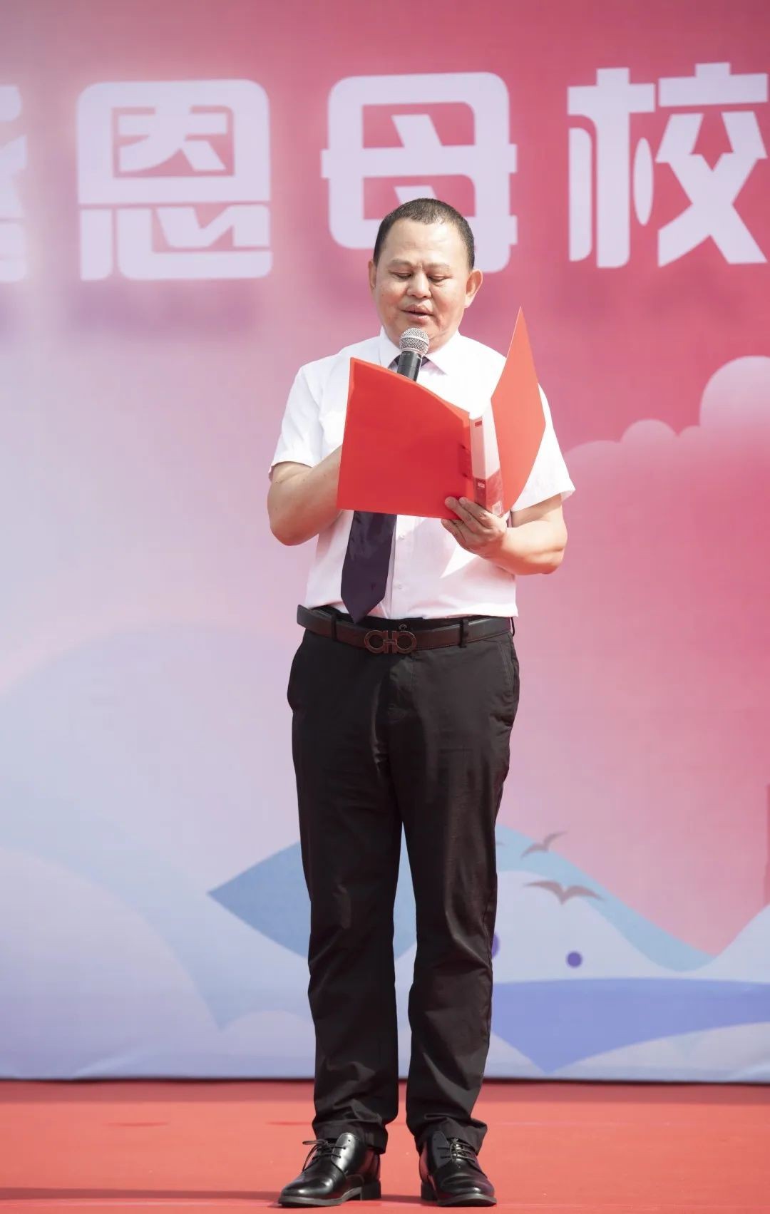 学校家委会主任王德伟先生发言,他代表全体高三家长向辛勤奋斗在教育战线的领导、老师们致以崇高的敬意和感谢。向毕业的高三学子们表示热烈祝贺,勉励学子们继续努力,感恩老师,回报母校。同时,他向学校和老师们送上一份感谢之礼——书法作品“金榜题名扬校威”以及精美的玫瑰花蓝,祝福学校蒸蒸日上,祝愿老师们每一天都氤氲着芬芳的花香。