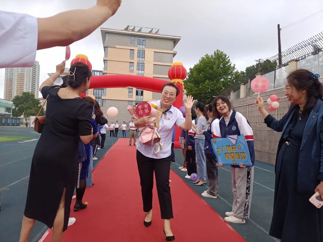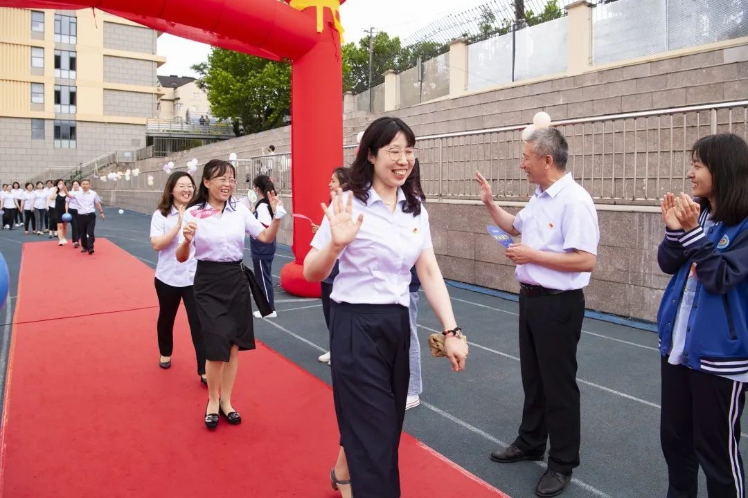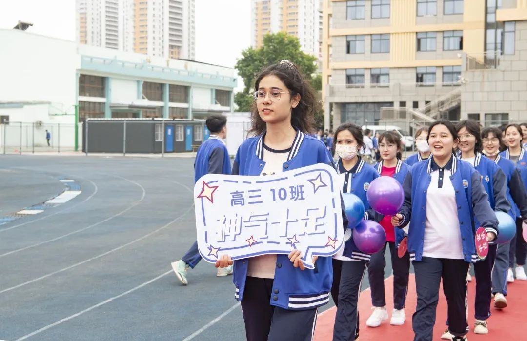随后,在学生们的一路欢呼和热烈掌声中,学校食堂、宿管、保卫后勤服务人员代表,新疆内派老师,高三任课老师,高三班主任和学校领导相继走过红毯入场。