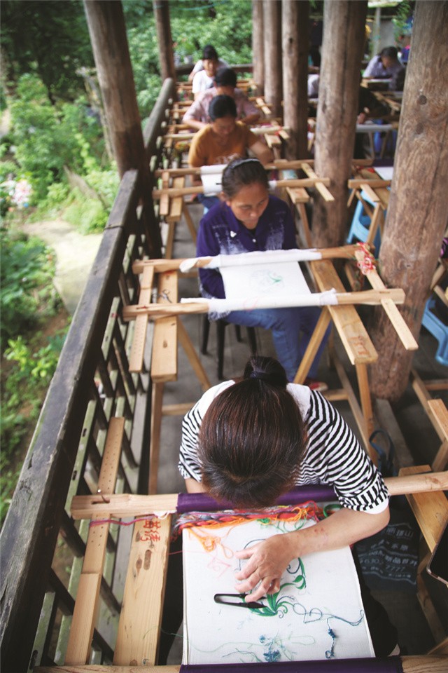 村民们在吊脚楼上学苗绣。廖唯 摄