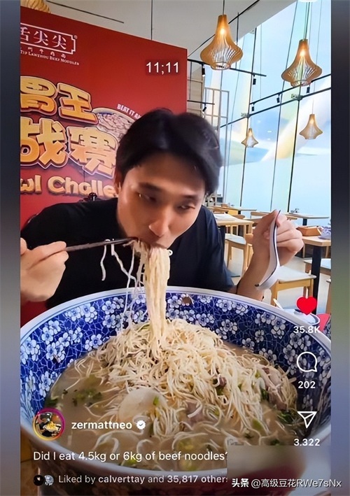有这样一位吃播,比吴半饱还要吓人。他居然能在40分钟的时间里吃下12公斤的肉脞面,吃得比吴半饱更快,量也更多,而且他本人还特别瘦。