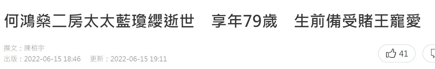 6月15日,根据港媒报道,已故赌王何鸿燊二房太太蓝琼缨上周六(6月11日)因癌症在养和医院病逝,享年79岁。所有子女都陪伴在旁送终,丧礼会由何超琼负责。据了解,二太患癌多时,过去一年已长期住在养和医院,在一个礼拜前陷入病危,被送入加护病房。