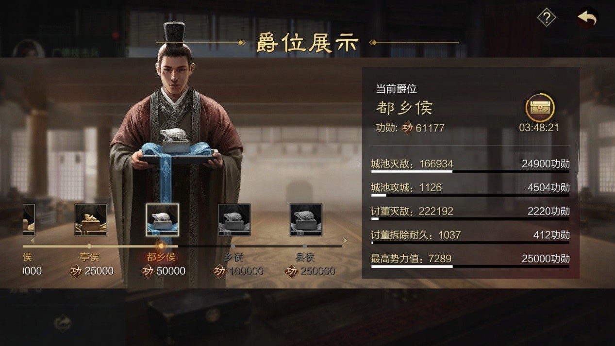 与传统赛季区别最大的就是本赛季的功勋系统取代了传统的武勋,成为衡量玩家贡献与成就的重要标准。玩家可以通过参与攻城、讨伐董卓军团营地、提升自身势力值等多种途径累积功勋。功勋的积累不仅能让玩家获封侯爵乃至王爵,还能享受丰厚的俸禄和资源奖励。小编则认为这是一个平衡机制,它鼓励玩家积极参与赛季的各个环节,无论你是“豹子头”还是月卡党,甚至就算没有“国家队”武将的加持,只要在攻城中发挥自己“拆迁大队”的实力,一样可以获得不俗奖励。