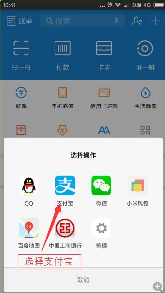 将卡贴于手机背部,一般都在摄像头下面的位置,手机会跳出下面这个页面,选择用什么执行,我们就选择支付宝。