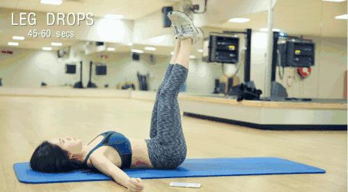 仰卧,双臂伸展于身体两侧,双腿并拢伸直向上抬起至90度后放下,共做4组。每组45到60秒,组间休息30秒。