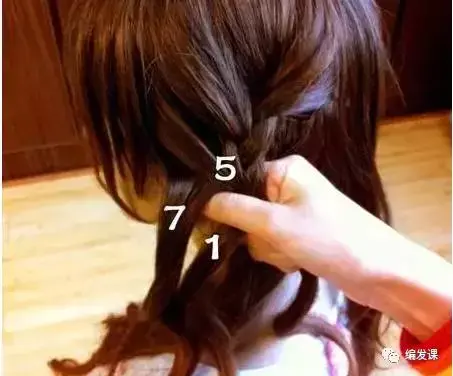 第五步:在3股的旁边取一发片,大小不得超过3号发量,标记为4,把标记为3和4,合二为一,标记为5,如图