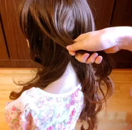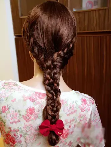 15:发尾用小皮筋固定,把编好的头发,向左右拉松最后,在发尾用发圈去装饰一下,就完成啦!
