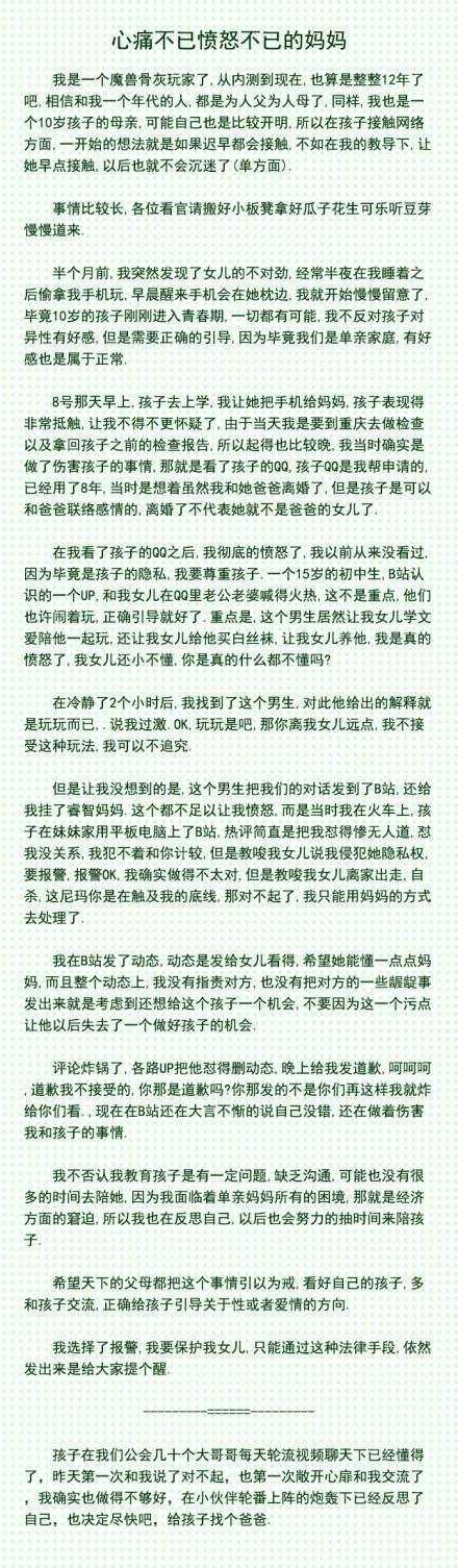 据了解,此事源起于一个母亲在NGA发帖求助,她发现自己10岁的女儿近况不佳,在随后的查阅中发现UP主“科里斯”一直在引导其女儿。站内存在的色情、变态、猎奇的“文化”触动这位母亲,随后其发帖求助。