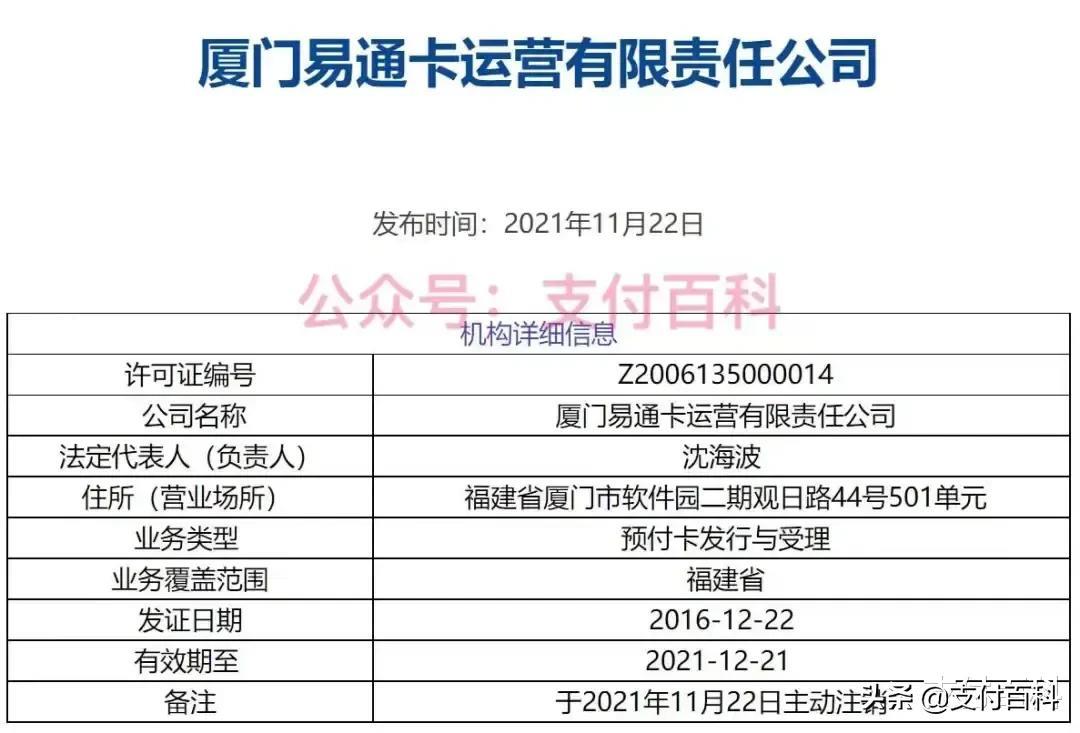 备注中显示,厦门易通卡运营有限责任公司于2021年11月22日主动注销,这已不是首张主动注销的支付牌照,在最近注销的支付牌照中,主动注销的支付机构占据绝大多数。 厦门易通卡运营有限责任公司成立于2004年,注册资本为7500万元人民币,法定代表人为沈海波,是以厦门市小额支付一卡通项目为主体的国有企业,随着业务的发展,其发卡范围一度从厦门拓展到周边地区。