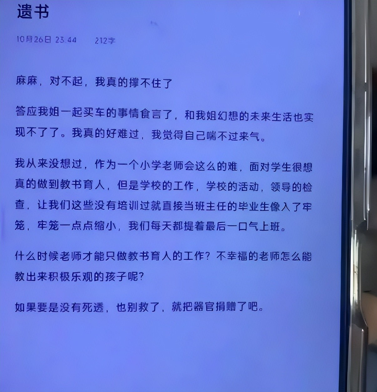 这位年轻教师在遗书中提出了两个重要问题,引发了社会广泛的反思。首先,她问道:“什么时候老师才能专注于教书育人的工作呢?” 这个问题指向了教育体制中的问题,即教师们不得不花费大量时间和精力在与教学无关的事务上。