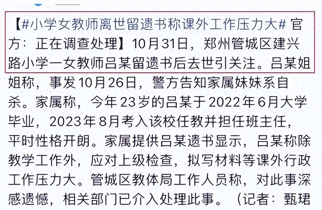这一事件还让我思考了教育体制下的压力问题。这位年轻教师提到,她从未想过当一名小学老师会如此困难,她感到自己像"入了牢笼"。这让我想到,教育工作者可能不仅仅需要教学技能,还需要履行各种管理和行政职责,这些任务与他们最初的教育梦想似乎格格不入。这种工作压力和职业挑战可能是导致她选择离世的原因之一。