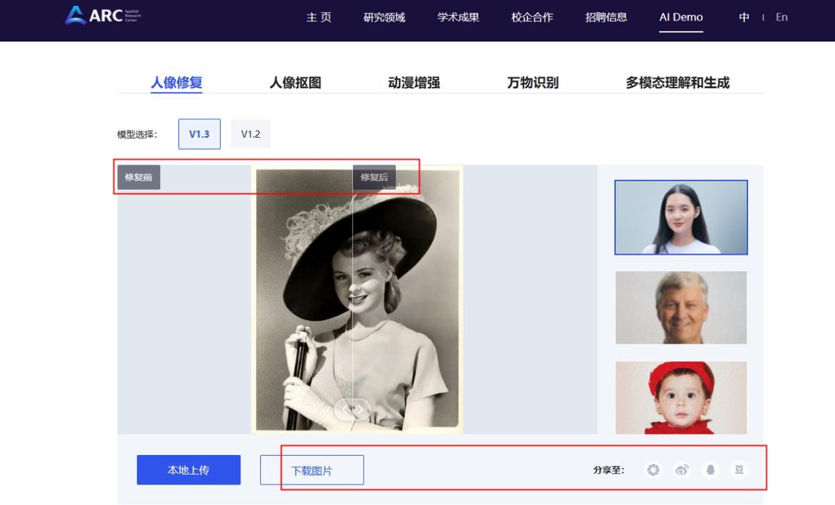 是腾讯公司对外展示其前沿技术研究成果和实验室动态的重要窗口,涉及的技术以视觉、音频和自然语言处理为主,其中的“AI Demo”也提供人像修复工具。