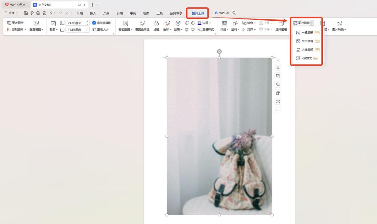 一款日常高频使用的办公软件,核心功能是文字编辑、表格处理和演示文稿制作,也有内置多种图片工具可供使用,图片修复就在其中,开通超级会员就能用。