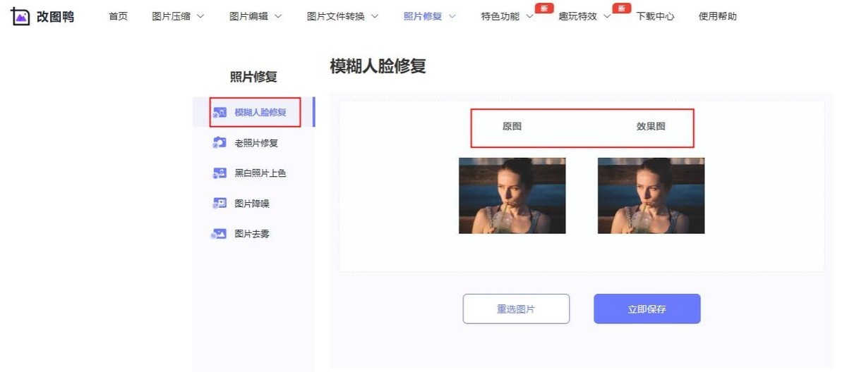 要用到的【照片修复】位于“图片编辑”模块,包括7种类型,选中后添加单图就能自动开启识别修复,还能随时对比原图,满意的话按下“立即保存”即可。