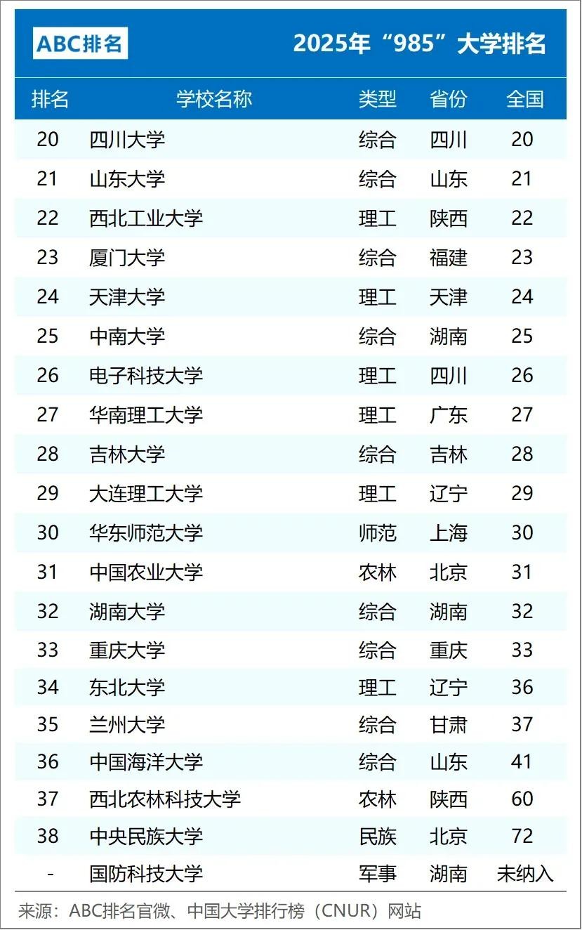 2025年ABC中国大学排行榜近日发布,39所"985工程"高校的竞争格局呈现出新变化。清华大学、北京大学继续稳居榜首,浙江大学与中国科学技术大学并列第三,形成"清北浙科"四强格局。