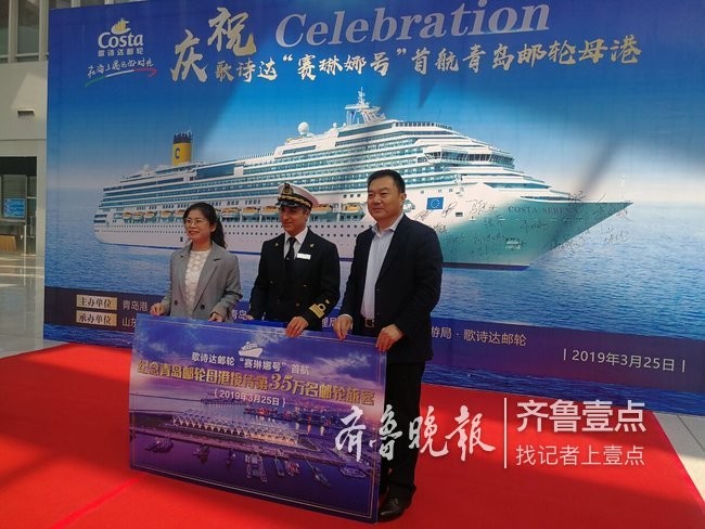 3月25日,11.45万吨级的意大利歌诗达邮轮“赛琳娜号”从青岛国际邮轮母港首航,这是迄今为止青岛邮轮母港航线迎来的最大邮轮。本次首航出入境旅客共7400余人,创出青岛邮轮母港开港以来单船出入境旅客最高纪录。当天,青岛邮轮母港举行了首航仪式并为第35万名幸运旅客颁授纪念铭牌和纪念品。