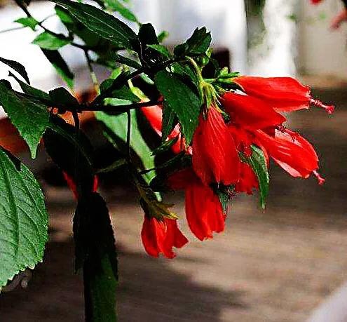 悬铃花,外形略似朱槿,高30-60厘米。叶有柄,互生,长橢圆形状,先端渐尖,叶缘锯齿状,主叶脉掌状,全年出叶,尤以3-8月为盛。花鲜红色(粉花悬铃花除外),花朵向下悬垂,较为奇特,四季开花,花量多。
