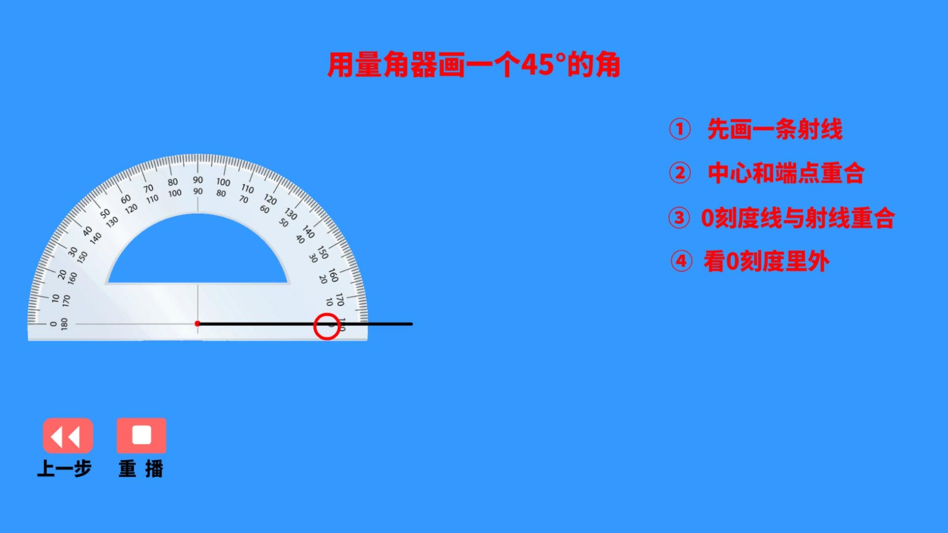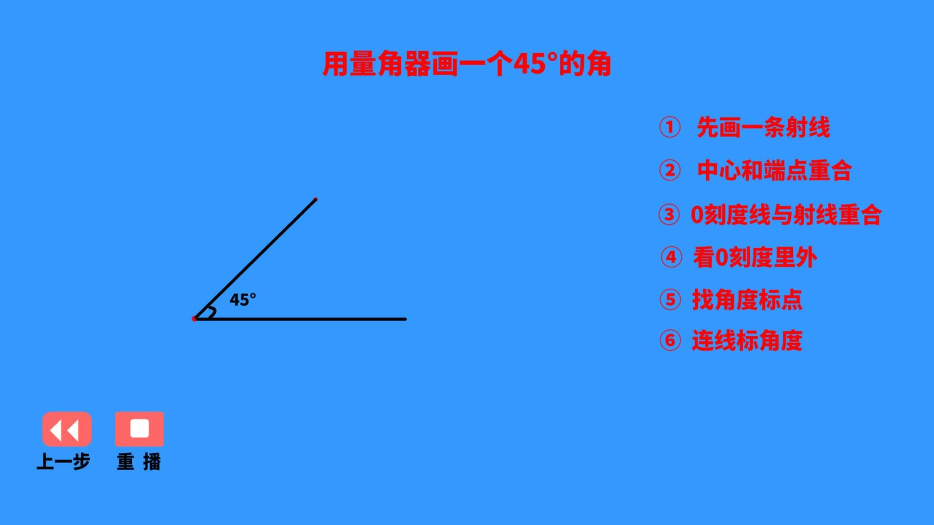 用量角器画一个45°的角。一画(画一条射线)二重合(中心点与端点重合,0刻度线与射线重合)三看(看0刻度里外)四找(找到45度画点)五连标(画线段标角标角度)。